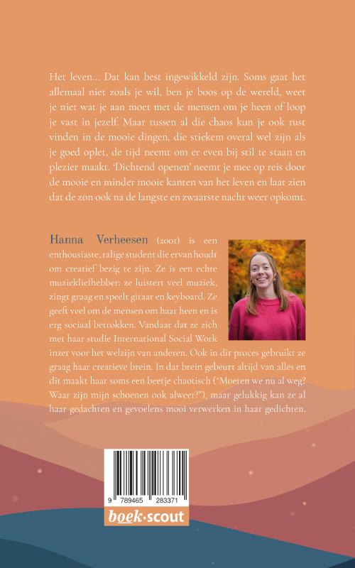 Het leven... Dat kan best ingewikkeld zijn. Soms gaat het allemaal niet zoals je wil, ben je boos op de wereld, weet je niet wat je aan moet met de mensen om je heen of loop je vast in jezelf. Maar tussen al die chaos kun je ook rust vinden in de mooie dingen, die stiekem overal wel zijn als je goed oplet, de tijd neemt om er even bij stil te staan en plezier maakt. ‘Dichtend openen’ neemt je mee op reis door de mooie en minder mooie kanten van het leven en laat zien dat de zon ook na de langste en zwaarste nacht weer opkomt.