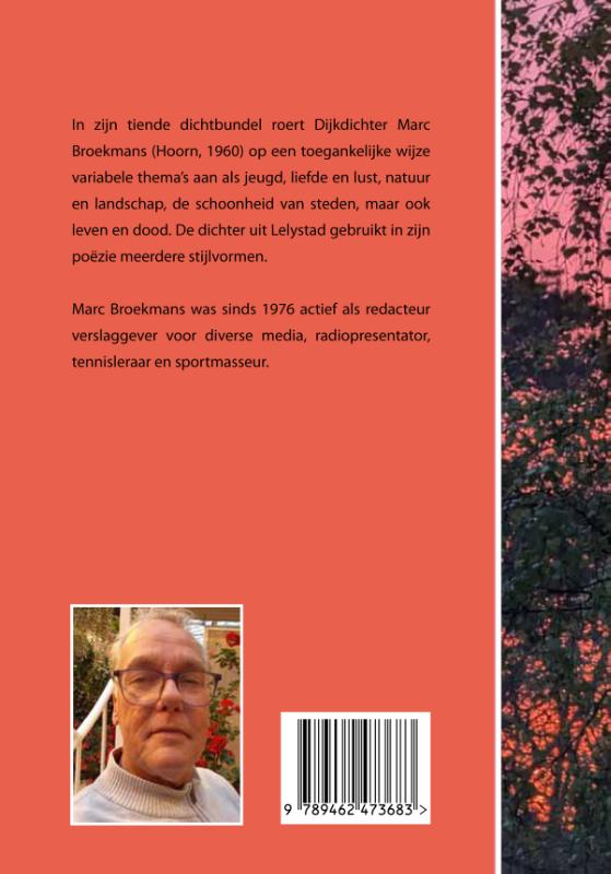 In zijn tiende dichtbundel roert Dijkdichter Marc Broekmans (Hoorn, 1960) op een toegankelijke wijze variabele thema’s aan als jeugd, liefde en lust, natuur en landschap, de schoonheid van steden, maar ook leven en dood. De dichter uit Lelystad gebruikt in zijn poëzie meerdere stijlvormen. Marc Broekmans was sinds 1976 actief als redacteur verslaggever voor diverse media, radiopresentator, tennisleraar en sportmasseur.