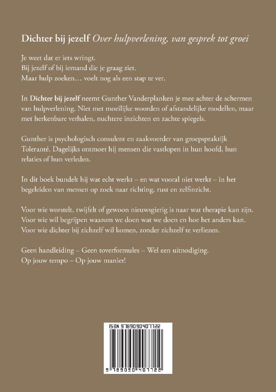 Dichter bij jezelf Over hulpverlening, van gesprek tot groei Je weet dat er iets wringt. Bij jezelf. Of bij iemand die je graag ziet. Maar hulp zoeken… voelt nog als een stap te ver. In Dichter bij jezelf neemt Gunther Vanderplanken je mee achter de schermen van hulpverlening. Niet met moeilijke woorden of afstandelijke modellen, maar met herkenbare verhalen, nuchtere inzichten en zachte spiegels. Gunther is psychologisch consulent en zaakvoerder van groepspraktijk ‘Toleranté’. Dagelijks ontmoet hij mensen die vastlopen in hun hoofd, hun relaties of hun verleden. In dit boek bundelt hij wat echt werkt – en wat vooral niet werkt – in het begeleiden van mensen op zoek naar richting, rust en zelfinzicht. Voor wie worstelt, twijfelt of gewoon nieuwsgierig is naar wat therapie kan zijn. Voor wie wil begrijpen waarom we doen wat we doen – en hoe het anders kan. Voor wie dichter bij zichzelf wil komen, zonder zichzelf te verliezen. Geen handleiding. Geen toverformules. Wel een uitnodiging. Op jouw tempo. Op jouw manier