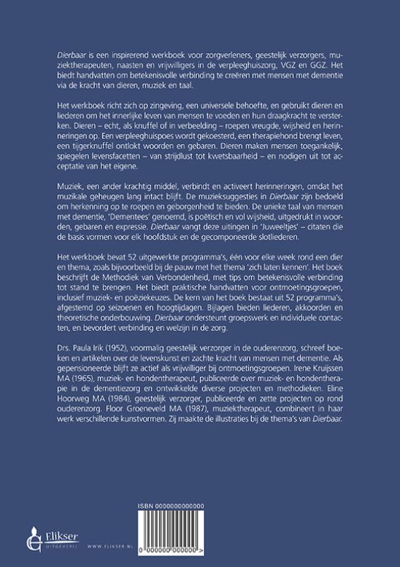 Dierbaar is een inspirerend werkboek voor zorgverleners, geestelijk verzorgers, muziektherapeuten, naasten en vrijwilligers in de verpleeghuiszorg, VGZ en GGZ. Het biedt handvatten om betekenisvolle verbinding te creëren met mensen met dementie via de kracht van dieren, muziek en taal. Het werkboek richt zich op zingeving, een universele behoefte, en gebruikt dieren en liederen om het innerlijke leven van mensen te voeden en hun draagkracht te versterken. Dieren – echt, als knuffel of in verbeelding – roepen vreugde, wijsheid en herinneringen op. Een verpleeghuispoes wordt gekoesterd, een therapiehond brengt leven, een tijgerknuffel ontlokt woorden en gebaren. Dieren maken mensen toegankelijk, spiegelen levensfacetten – van strijdlust tot kwetsbaarheid – en nodigen uit tot acceptatie van het eigene. Muziek, een ander krachtig middel, verbindt en activeert herinneringen, omdat het muzikale geheugen lang intact blijft. De muzieksuggesties in Dierbaar zijn bedoeld om herkenning op te roepen en geborgenheid te bieden. De unieke taal van mensen met dementie, ‘Dementees’ genoemd, is poëtisch en vol wijsheid, uitgedrukt in woorden, gebaren en expressie. Dierbaar vangt deze uitingen in ‘Juweeltjes’ – citaten die de basis vormen voor elk hoofdstuk en de gecomponeerde slotliederen. Het werkboek bevat 52 uitgewerkte programma’s, één voor elke week rond een dier en thema, zoals bijvoorbeeld bij de pauw met het thema ‘zich laten kennen’. Het boek beschrijft de Methodiek van Verbondenheid, met tips om betekenisvolle verbinding tot stand te brengen. Het biedt praktische handvatten voor ontmoetingsgroepen, inclusief muziek- en poëziekeuzes. De kern van het boek bestaat uit 52 programma’s, afgestemd op seizoenen en hoogtijdagen. Bijlagen bieden liederen, akkoorden en theoretische onderbouwing. Dierbaar ondersteunt groepswerk en individuele contacten, en bevordert verbinding en welzijn in de zorg. Drs. Paula Irik (1952), voormalig geestelijk verzorger in de ouderenzorg, schreef boeken en artikelen over de levenskunst en zachte kracht van mensen met dementie. Als gepensioneerde blijft ze actief als vrijwilliger bij ontmoetingsgroepen. Irene Kruijssen MA (1965), muziek- en hondentherapeut, publiceerde over muziek- en hondentherapie in de dementiezorg en ontwikkelde diverse projecten en methodieken. Eline Hoorweg MA (1984), geestelijk verzorger, publiceerde en zette projecten op rond ouderenzorg. Floor Groeneveld MA (1987), muziektherapeut, combineert in haar werk verschillende kunstvormen. Zij maakte de illustraties bij de thema’s van Dierbaar.