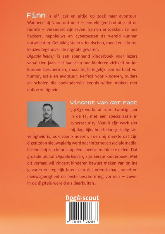 Finn is elf jaar en altijd op zoek naar avontuur. Wanneer hij Nano ontmoet – een vliegend robotje uit de ruimte – verandert zijn leven. Samen ontdekken ze hoe hackers, nepnieuws en cyberpesten de wereld kunnen ontwrichten. Gelukkig staan vriendschap, moed en slimme keuzes tegenover de digitale gevaren. Digitale helden is een spannend kinderboek voor lezers vanaf tien jaar. Het laat zien hoe kinderen zichzelf online kunnen beschermen, maar blijft tegelijk een verhaal vol humor, actie en avontuur. Perfect voor kinderen, ouders en scholen die spelenderwijs kennis willen maken met online veiligheid.