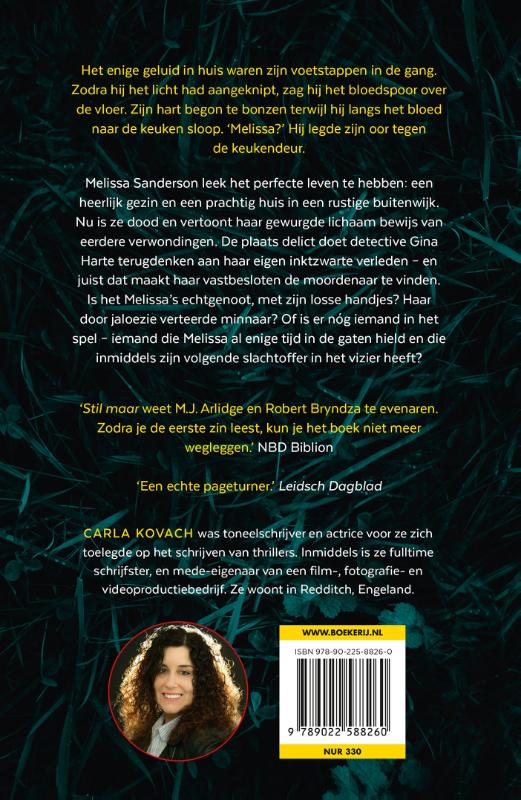 Na het lovend ontvangen Stil maar verschijnt nu de tweede thriller met rechercheur Gina Harte in de hoofdrol. ‘Een pageturner met een finale die je je nagels kost.’ Libelle over Stil maar , boek van de maand juni Het enige geluid in huis waren zijn voetstappen in de gang. Zodra hij het licht had aangeknipt, zag hij het bloedspoor over de vloer. Zijn hart begon te bonzen terwijl hij langs het bloed naar de keuken sloop. ‘Melissa?’ Hij legde zijn oor tegen de keukendeur. Melissa Sanderson leek het perfecte leven te hebben: een heerlijk gezin en een prachtig huis in een rustige buitenwijk. Nu is ze dood en vertoont haar gewurgde lichaam bewijs van eerdere verwondingen. De plaats delict doet detective Gina Harte terugdenken aan haar eigen inktzwarte verleden – en juist dat maakt haar vastbesloten de moordenaar te vinden. Is het Melissa’s echtgenoot, met zijn losse handjes? Haar door jaloezie verteerde minnaar? Of is er nóg iemand in het spel – iemand die Melissa al enige tijd in de gaten hield en die inmiddels zijn volgende slachtoffer in het vizier heeft? In de pers ‘Een echte pageturner.’ Leidsch Dagblad ‘ Stil maar weet M.J. Arlidge en Robert Bryndza te evenaren. Zodra je de eerste zin leest, kun je het boek niet meer wegleggen.’ NBD Biblion ‘Pageturner-spanning en uiteindelijk een finale die je je nagels kost. Deze nieuwe serie over detective Gina Harte is een aanrader voor fans van M.J. Arlidge en Robert Bryndza!’ Boekenleven.nl ‘We kijken uit naar de volgende thriller met Gina Harte in de hoofdrol.’ Thrillzone.nl ‘Een prachtig eerste deel van een serie – Carla Kovach maakt je direct nieuwsgierig naar hoe het verdergaat.’ ***** Chicklit.nl