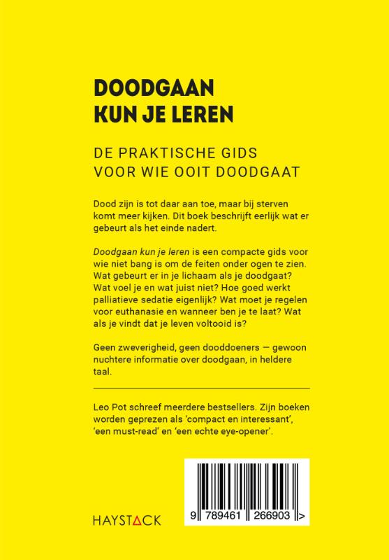 Dood zijn is tot daar aan toe, maar bij sterven komt meer kijken. Dit boek beschrijft eerlijk wat er gebeurt als het einde nadert. Doodgaan kun je leren is een compacte gids voor wie niet bang is om de feiten onder ogen te zien. Wat gebeurt er in je lichaam als je doodgaat? Wat voel je en wat juist niet? Hoe goed werkt palliatieve sedatie eigenlijk? Wat moet je regelen voor euthanasie en wanneer ben je te laat? Wat als je vindt dat je leven voltooid is? Geen zweverigheid, geen dooddoeners — gewoon nuchtere informatie over doodgaan, in heldere taal. Leo Pot schreef meerdere bestsellers. Zijn boeken worden geprezen als 'compact en interessant', 'een must-read' en 'een echte eye-opener'.