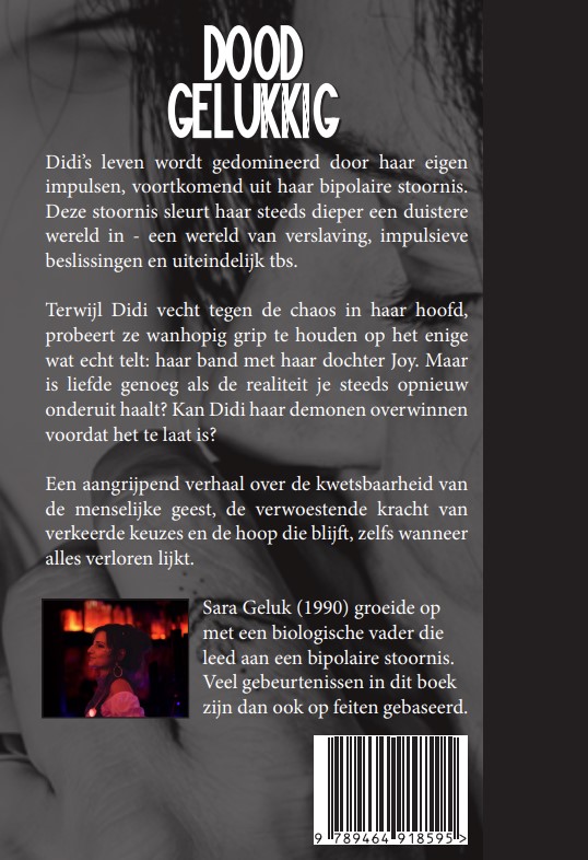 Didi's leven wordt gedomineerd door haar eigen impulsen, voortkomend uit haar bipolaire stoornis. Deze stoornis sleurt haar steeds dieper een duistere wereld in -een wereld van verslaving, impulsieve beslissingen en uiteindelijk tbs. Terwijl Didi vecht tegen de chaos in haar hoofd, probeert ze wanhopig grip te houden op het enige wat echt telt: haar band met haar dochter Joy. Maar is liefde genoeg als de realiteit je steeds opnieuw onderuit haalt? Kan Didi haar demonen overwinnen voordat het te laat is? Een aangrijpend verhaal over de kwetsbaarheid van de menselijke geest, de verwoestende kracht van verkeerde keuzes en de hoop die blijft, zelfs wanneer alles verloren lijkt. Sara Geluk (1990) groeide op met een biologische vader die leed aan een bipolaire stoornis. Veel gebeurtenissen in dit boek zijn dan ook op feiten gebaseerd.