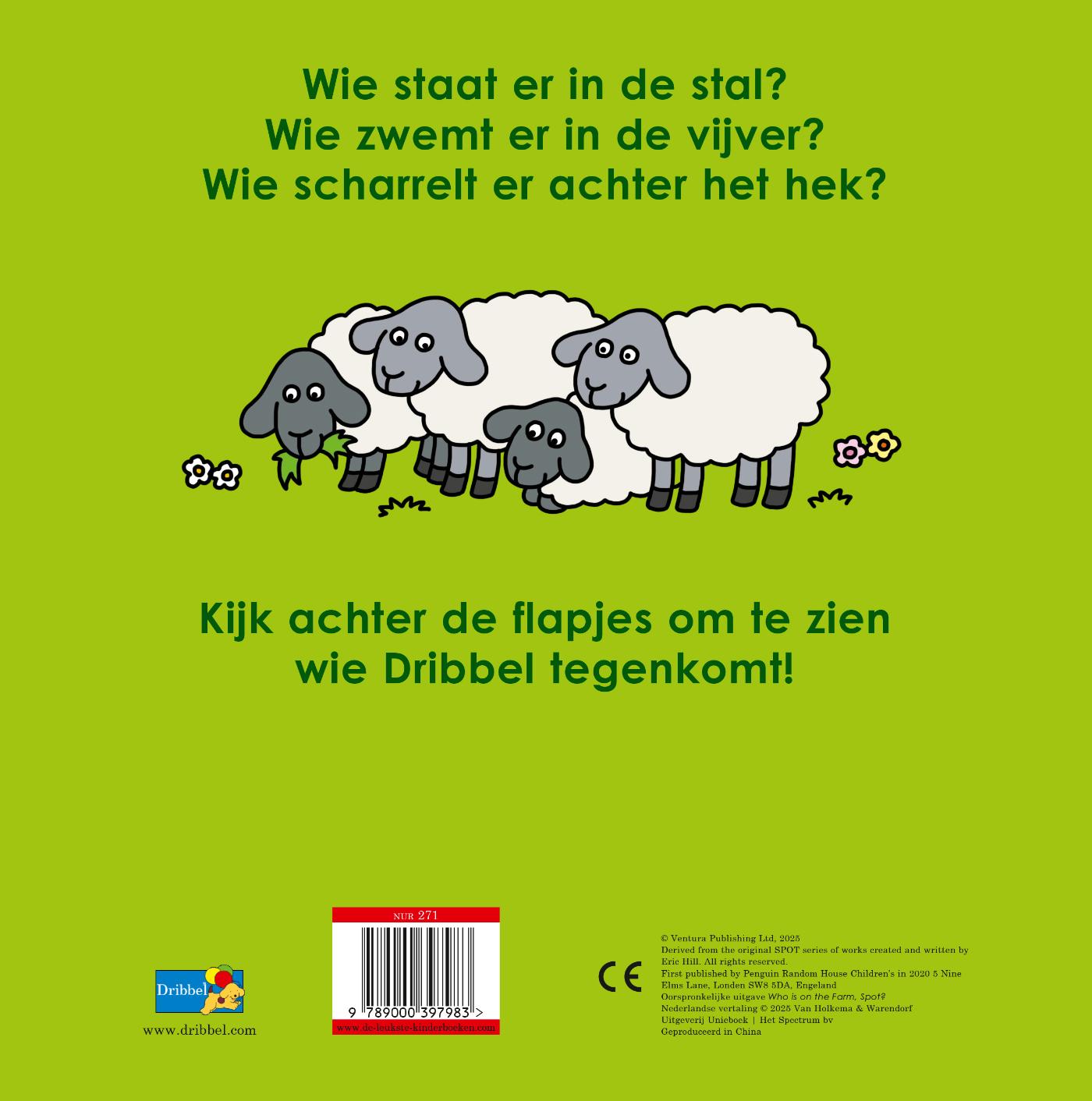 Ga met Dribbel mee naar de boerderij! Dribbel brengt samen met zijn moeder een bezoekje aan de boerderij! Daar hoort hij allerlei geluiden die hij nog niet kent. Kijk achter de dubbele flapjes en ontdek samen met Dribbel wie er allemaal op de boerderij wonen. Dribbel op de boerderij is een nieuw avontuur waarin de nieuwsgierigheid en verbeelding van peuters vanaf 18 maanden worden geprikkeld. Met de interactieve dubbele flapjes oefenen ze spelenderwijs hun motoriek. Stevig kartonboek met dubbele flapjes en afgeronde hoeken die geschikt zijn voor kleine handen