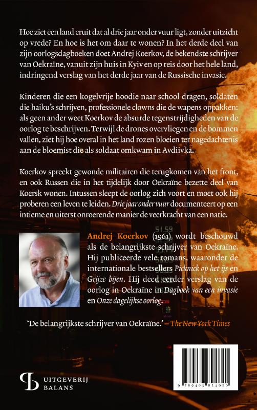 Hoe ziet een land eruit dat al drie jaar onder vuur ligt, zonder uitzicht op vrede? En hoe is het om daar te wonen? In het derde deel van zijn oorlogsdagboeken doet Andrej Koerkov, de bekendste schrijver van Oekraïne, vanuit zijn huis in Kyiv en op reis door het hele land, indringend verslag van het derde jaar van de Russische invasie. Kinderen die een kogelvrije hoodie naar school dragen, soldaten die haiku’s schrijven, professionele clowns die de wapens oppakken: als geen ander weet Koerkov de absurde tegenstrijdigheden van de oorlog te beschrijven. Terwijl de drones overvliegen en de bommen vallen, ziet hij hoe overal in het land rozen bloeien ter nagedachtenis aan de bloemist die als soldaat omkwam in Avdiivka. Koerkov spreekt gewonde militairen die terugkomen van het front, en ook Russen die in het tijdelijk door Oekraïne bezette deel van Koersk wonen. Intussen sleept de oorlog zich voort en moet ook hij proberen een leven te leiden. Drie jaar onder vuur documenteert op een intieme en uiterst onroerende manier de veerkracht van een natie.