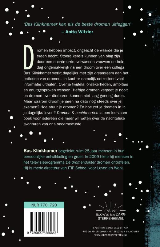 'Bas klinkhamer kan als de beste dromen uitleggen.' Anita Witzier Dromen hebben impact, ongeacht de waarde die je eraan hecht. Stoere kerels kunnen van slag zijn door een nachtmerrie, volwassen vrouwen de hele dag ongemakkelijk na een droom over een collega. Bas Klinkhamer werkt dagelijks met zijn dreamteam aan het ontleden van dromen. Je kunt er namelijk ontzettend veel informatie uithalen. Over je twijfels, onzekerheden, ambities en onuitgesproken wensen. Heftige dromen vergeet je nooit en dromen over dierbaren kunnen niet lang genoeg duren. Maar waarom droom je jaren na dato nog steeds over je examen? Hoe stuur je dromen? En hoe zet je dromen in in je dagelijks leven? Dromen & nachtmerries is een leerzaam boek voor iedereen die meer wilt weten over de nachtelijke avonturen van ons onderbewuste. • Uitgebreide uitleg over de meest voorkomende dromen • Handleiding om je unieke dromen te leren begrijpen • Bas 'Dromendokter' Klinkhamer en zijn dreamteam zijn autoriteiten op het gebied van dromen Bas Klinkhamer begeleidt ruim 25 jaar mensen in hun persoonlijke ontwikkeling en groei. In 2009 hielp hij mensen in het televisieprogramma De dromendokter dromen ontrafelen. Hij is mededirecteur van ITIP School voor Leven en Werk.