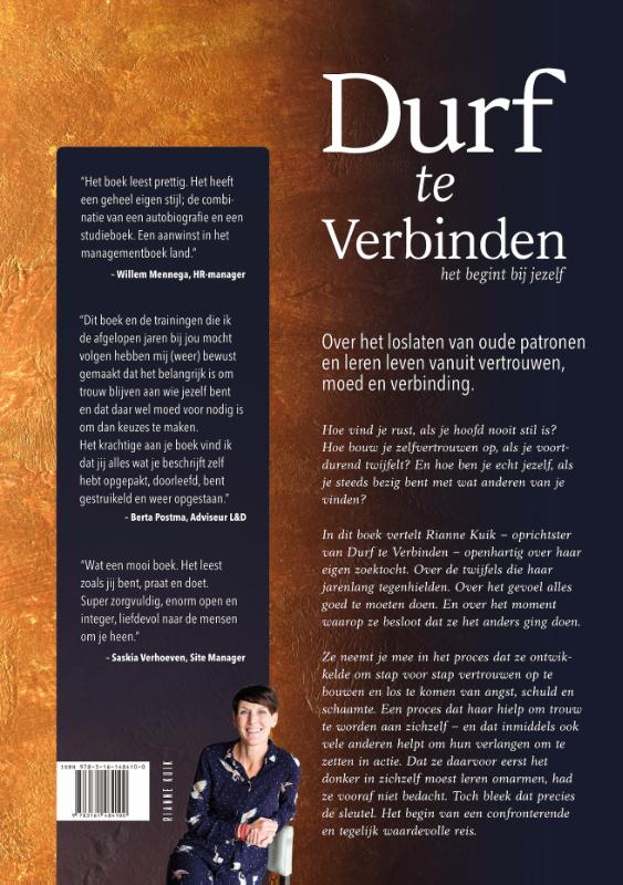 Over het loslaten van oude patronen en leren leven vanuit vertrouwen, moed en verbinding. Hoe vind je rust, als je hoofd nooit stil is? Hoe bouw je zelfvertrouwen op, als je voortdurend twijfelt? En hoe ben je echt jezelf, als je steeds bezig bent met wat anderen van je vinden? In dit boek vertelt Rianne Kuik – oprichtster van Durf te Verbinden – openhartig over haar eigen zoektocht. Over de twijfels die haar jarenlang tegenhielden. Over het gevoel alles goed te moeten doen. En over het moment waarop ze besloot dat ze het anders ging doen. Ze neemt je mee in het proces dat ze ontwikkelde om stap voor stap vertrouwen op te bouwen en los te komen van angst, schuld en schaamte. Een proces dat haar hielp om trouw te worden aan zichzelf – en dat inmiddels ook vele anderen helpt om hun verlangen om te zetten in actie. Dat ze daarvoor eerst het donker in zichzelf moest leren omarmen, had ze vooraf niet bedacht. Toch bleek dat precies de sleutel. Het begin van een confronterende en tegelijk waardevolle reis.
