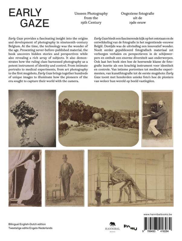 EARLY GAZE Unseen Photographyfrom the 19th Century Ongeziene fotografie uit de 19de eeuw Early Gaze provides a fascinating insight into the origins and development of photography in nineteenth-century Belgium. At the time, the technology was the wonder of the age. Presenting never-before-published material, the book uncovers hidden stories and perspectives while also revealing a rich array of subjects. It also demonstrates how the ruling class harnessed photography as a potent instrument of identity and control. From intimate portraits to medical experiments, from art photography to the first mugshots, Early Gaze brings together hundreds of unique images to illuminate how the pioneers of the era sought to capture their world with the camera. Early Gaze biedt een fascinerende kijk op het ontstaan en de ontwikkeling van de fotografie in het negentiende-eeuwse België. Destijds was de uitvinding een innovatief wonder. Nooit eerder gepubliceerd fotografisch materiaal zet verborgen verhalen en perspectieven in de schijnwerpers en onthult een enorme diversiteit aan onderwerpen. Ook laat het boek zien hoe de heersende klasse de fotografie inzette als een krachtig instrument voor identiteit en controle. Van intieme portretten tot medische experimenten, van kunstfotografie tot de eerste mugshots: Early Gaze toont met honderden unieke foto’s hoe de pioniers van weleer hun wereld op beeld vastlegden.
