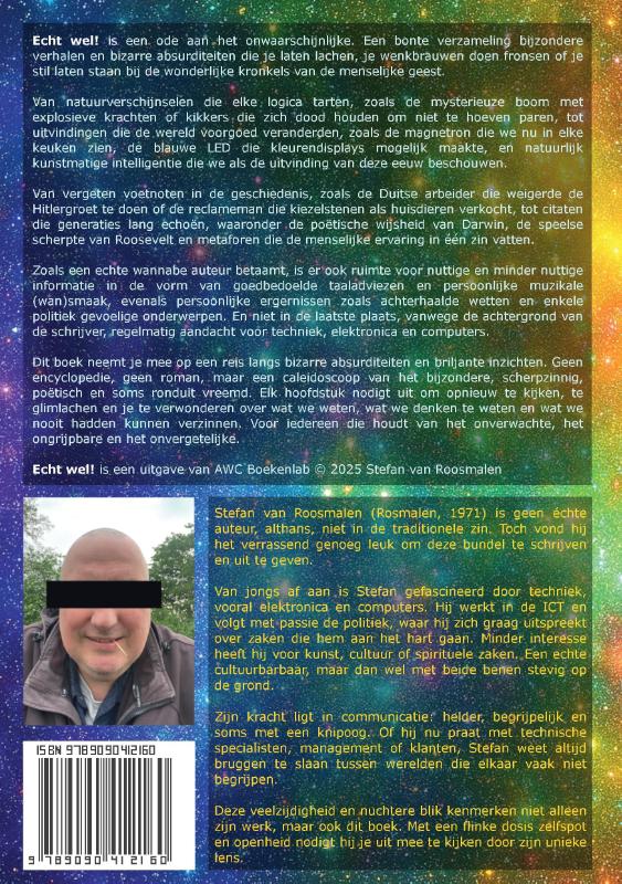 Echt wel! is een ode aan het onwaarschijnlijke. Een bonte verzameling bijzondere verhalen en bizarre absurditeiten die je laten lachen, je wenkbrauwen doen fronsen of je stil laten staan bij de wonderlijke kronkels van de menselijke geest. Van natuurverschijnselen die elke logica tarten, zoals de mysterieuze boom met explosieve krachten of kikkers die zich dood houden om niet te hoeven paren, tot uitvindingen die de wereld voorgoed veranderden, zoals de magnetron die we nu in elke keuken zien, de blauwe LED die kleurendisplays mogelijk maakte, en natuurlijk kunstmatige intelligentie die we als de uitvinding van deze eeuw beschouwen. Van vergeten voetnoten in de geschiedenis, zoals de Duitse arbeider die weigerde de Hitlergroet te doen of de reclameman die kiezelstenen als huisdieren verkocht, tot citaten die generaties lang echoën, waaronder de poëtische wijsheid van Darwin, de speelse scherpte van Roosevelt en metaforen die de menselijke ervaring in één zin vatten. Zoals een echte wannabe auteur betaamt, is er ook ruimte voor nuttige en minder nuttige informatie in de vorm van goedbedoelde taaladviezen en persoonlijke muzikale (wan)smaak, evenals persoonlijke ergernissen zoals achterhaalde wetten en enkele politiek gevoelige onderwerpen. En niet in de laatste plaats, vanwege de achtergrond van de schrijver, regelmatig aandacht voor techniek, electronica en computers. Dit boek neemt je mee op een reis langs bizarre absurditeiten en briljante inzichten. Geen encyclopedie, geen roman, maar een caleidoscoop van het bijzondere, scherpzinnig, poëtisch en soms ronduit vreemd. Elk hoofdstuk nodigt uit om opnieuw te kijken, te glimlachen en je te verwonderen over wat we weten, wat we denken te weten en wat we nooit hadden kunnen verzinnen. Voor iedereen die houdt van het onverwachte, het ongrijpbare en het onvergetelijke.