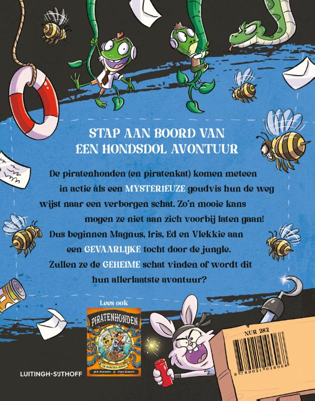 Piratenhonden van Jack Henseleit en illustrator Chris Kennett is een supergrappige graphic-novelserie voor beginnende lezers. Magnus, Iris, Ed en Vlekkie zijn terug voor een gloednieuw avontuur. Na hun belevenissen in De gebeten hond stuiten de drie piratenhonden en één kat op een nieuw mysterie. Een raadselachtige goudvis wijst hun de weg naar een lang verloren gewaande schat, diep verborgen in een geheime grot. Zo'n kans kunnen ze niet voorbij laten gaan, toch? Dus waagt het viertal zich aan een gevaarlijke tocht door de jungle. Zullen ze de legendarische grot vinden – of wordt dit hun allerlaatste avontuur?