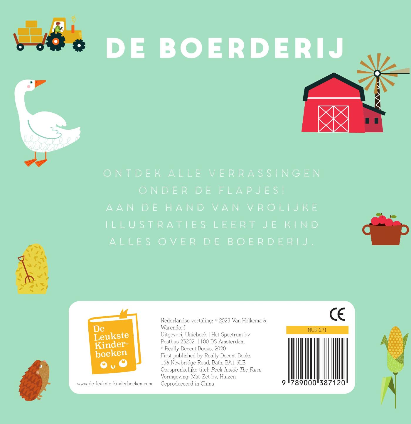 Kom je kijken op de boerderij? Hoor je de paarden hinniken? Zie je de wortels en spruitjes in het veld? We zijn op de boerderij! Kijk achter de flapjes en ontdek welke dieren in de stallen wonen, welke groentes er op de akker staan, en wie er in het meertje rondzwemmen. Zo leer je meer dan honderd boerderijwoorden! Een kijkje op de boerderij is een kleurrijk kartonboek met afgeronde hoeken en stevige flappen, zodat peuters en kleuters alles over de boerderij kunnen ontdekken. De perfecte combinatie van spelen en leren voor kinderen vanaf 18 maanden. Met stevige kartonpagina’s die geschikt zijn voor kleine handjes.