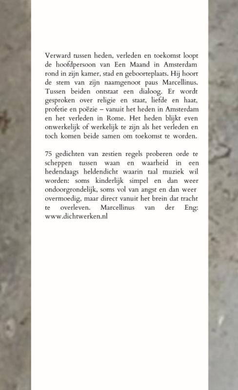 Verward tussen heden, verleden en toekomst loopt de hoofdpersoon van Een Maand in Amsterdam rond in zijn kamer, stad en geboorteplaats. Hij hoort de stem van zijn naamgenoot paus Marcellinus. Tussen beiden ontstaat een dialoog. Er wordt gesproken over religie en staat, liefde en haat, profetie en poëzie – vanuit het heden in Amsterdam en het verleden in Rome. Het heden blijkt even onwerkelijk of werkelijk te zijn als het verleden en toch komen beide samen om toekomst te worden. 75 gedichten van zestien regels proberen orde te scheppen tussen waan en waarheid in een hedendaags heldendicht waarin taal muziek wil worden: soms kinderlijk simpel en dan weer ondoorgrondelijk, soms vol van angst en dan weer overmoedig, maar direct vanuit het brein dat tracht te overleven. Over de auteur: www.dichtwerken.nl