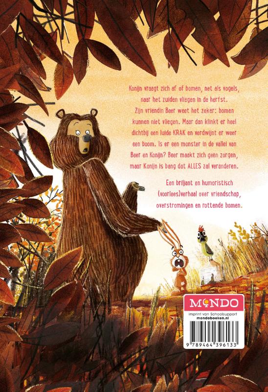 Konijn vraagt zich af of bomen, net als vogels, naar het zuiden vliegen in de herfst. Zijn vriendin Beer weet het zeker: bomen kunnen niet vliegen. Maar dan klinkt er heel dichtbij een luide KRAK en verdwijnt er weer een boom. Is er een monster in de vallei van Beer en Konijn? Beer maakt zich geen zorgen, maar Konijn is bang dat ALLES zal veranderen. Een briljant en humoristisch (voorlees)verhaal over vriendschap, overstromingen en rottende bomen.