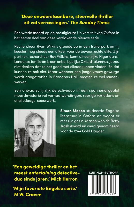 Een moord in november is het bloedstollend spannende eerste deel in de Oxford-serie van prijswinnend auteur Simon Mason. Een onwaarschijnlijk detectiveduo wordt geconfronteerd met een huiveringwekkend moordmysterie. Rechercheur Ryan Wilkins groeide op in een trailerpark, en is zijn afkeer voor de geprivilegieerde elite die op hem neerkeek nog altijd niet vergeten; zo ook niet zijn slechte manieren. Maar Ryan ziet dingen die anderen niet zien. Zijn partner, DI Ray Wilkins, is een goed verzorgde, charismatische man van rijke Nigeriaanse-Londense afkomst en is afgestudeerd aan het prestigieuze Balliol College in Oxford. Je zou niet denken dat de twee het goed met elkaar kunnen vinden. En dat kunnen ze ook niet. Maar wanneer er een jonge vrouw gewurgd wordt gevonden bij Barnabas Hall, moeten ze wel. Wat deed de dode vrouw in het kantoor van de opvliegende provoost? En is het puur toeval dat er op de nacht van de moord hoog bezoek was van Sheik al-Medina? Een man die in eigen land is gelinkt aan meerdere mensenrechtenschendingen. Wanneer de spanning stijgt, ontdekt het duo geleidelijk verbanden tussen een Syrische vluchteling die werkt in de keuken van de universiteit, een onbetaalbaar exemplaar van de Koran in de universiteitscollectie en de identiteit van het slachtoffer.
