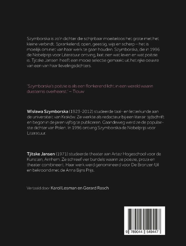 Szymborska is zo’n dichter die schijnbaar moeiteloos het grote met het kleine verbindt. Sprankelend, open, geestig, wijs en scherp – het is moeilijk om niet van haar werk te gaan houden. Szymborska, die in 1996 de Nobel­prijs voor Literatuur ontving, laat zien wat leven en wat poëzie is. Tjitske Jansen heeft een mooie selectie gemaakt uit het rijke oeuvre van een van haar lievelingsdichters.