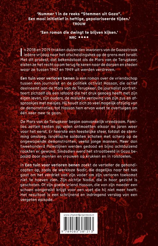 In 2018 en 2019 trokken duizenden inwoners van de Gazastrook iedere vrijdag naar het afscheidingshek op de grens met Israël. Met dit protest, dat bekendstaat als de Mars van de Terugkeer, eisten ze het recht op om terug te keren naar de dorpen en steden waar ze tussen 1947 en 1949 uit waren verdreven. De Mars van de Terugkeer begon aanvankelijk vreedzaam. Families zetten tenten op; velen ontmoetten elkaar na jaren weer voor het eerst. Er heerste een feestelijke sfeer, totdat de stemming omsloeg. Israëlische soldaten schoten met scherp op de demonstranten, veelal jonge mannen. Meer dan tweehonderd Palestijnen werden gedood en bijna achtduizend raakten er gewond. Sindsdien werd het straatbeeld in Gaza bepaald door mannen en vrouwen op krukken en in rolstoelen. In 'Een tuin voor verloren benen' zoekt de verteller de gehandicapten op, zoals de werkloze Nadir, die dagelijks naar het hek gaat om het verdriet van zijn vader om zijn verloren toekomst niet te hoeven zien. Zijn nicht Nadia, die in haar gezicht is geschoten. Of zijn goede vriend Hassan, die van zijn moeder een schoen aangereikt krijgt voor een voet die hij niet meer heeft. Het resultaat is een schrijnend en indringend verslag van een vergeten episode. Mahmoud Jouda (1985) is psycholoog en schrijver. Hij werkt als journalist en schrijft korte verhalen en romans. 'Een tuin voor verloren benen' is zijn tweede roman. In maart 2024 vluchtte hij met zijn familie vanuit de Gazastrook naar Egypte. Uit het Arabisch vertaald door Djûke Poppinga / ISBN 978 90 833812 1 3 / 156 pag. / 21,90 / boek met flappen