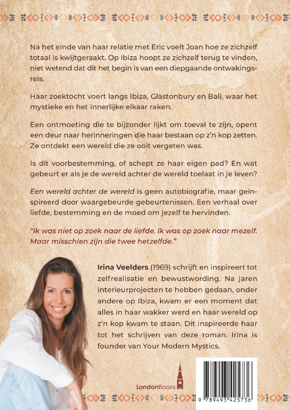 Na het einde van haar relatie met Eric voelt Joan hoe ze zichzelf totaal is kwijtgeraakt. Op Ibiza hoopt ze zichzelf terug te vinden, niet wetend dat dit het begin is van een diepgaande ontwakingsreis. Haar zoektocht voert langs Ibiza, Glastonbury en Bali, waar het mystieke en het innerlijke elkaar raken. Een ontmoeting die te bijzonder lijkt om toeval te zijn, opent een deur naar herinneringen die haar bestaan op z’n kop zetten. Ze ontdekt een wereld die ze ooit vergeten was.Is dit voorbestemming, of schept ze haar eigen pad? En wat gebeurt er als je de wereld achter de wereld toelaat in je leven? Een wereld achter de wereld is geen autobiografie, maar geïnspireerd door waargebeurde gebeurtenissen. Een verhaal over liefde, bestemming en de moed om jezelf te hervinden. “Ik was niet op zoek naar de liefde. Ik was op zoek naar mezelf. Maar misschien zijn die twee hetzelfde.” Irina Veelders (1969) schrijft en inspireert tot zelfrealisatie en bewustwording. Na jaren interieurprojecten te hebben gedaan, onder andere op Ibiza, kwam er een moment dat alles in haar wakker werd en haar wereld op z’n kop kwam te staan. Dit inspireerde haar tot het schrijven van deze roman. Irina is founder van Your Modern Mystics.