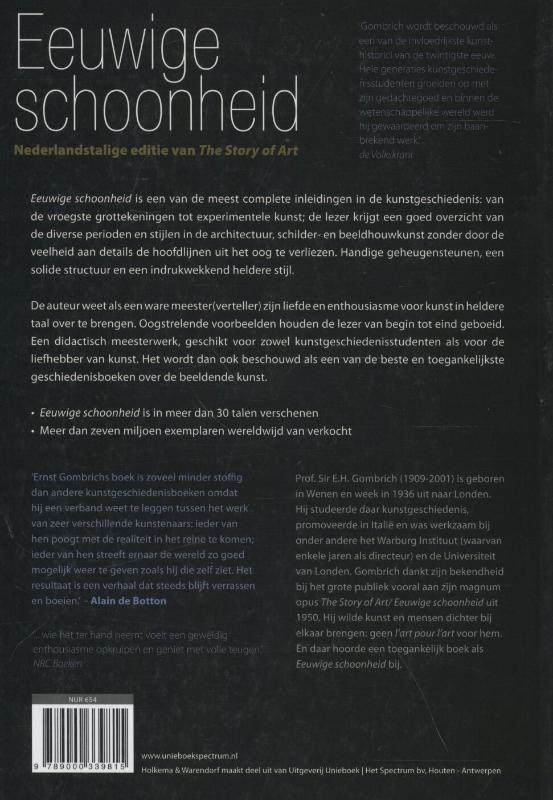 Didactisch meesterwerk Een van de meest complete én toegankelijke inleidingen in de kunstgeschiedenis. In Eeuwige schoonheid krijgt u een goed overzicht van de diverse perioden en stijlen in de architectuur, schilder- en beeldhouwkunst zonder door de veelheid aan details de hoofdlijnen uit het oog te verliezen, vanaf de vroegste grottekeningen tot experimentele kunst.De auteur weet als een ware meester(verteller) zijn liefe en enthousiasme voor kunst in heldere taal over te brengen. Oogstrelende voorbeelden houden u van begin tot eind geboeid. Het wordt beschouwd als een van de beste en toegankelijkste geschiedenisboeken over de beeldende kunst. Ernst Gombrich wordt beschouwd als één van de invloedrijkste kunsthistorici van de twintigste eeuw. Hij studeerde in Londen kunstgeschiedenis, promoveerde in Italië en was werkzaam bij onder andere het Warburg Instituut (waarvan enkele jaren als directeur) en de Universiteit van Londen. Gombrich wil kunst en mensen dichter bij elkaar brengen: geen l’art pour l’art voor hem. Zijn Eeuwige schoonheid is meer dan 60 jaar oud, maar nog steeds zeer populair. – Geschikt voor zowel kunstgeschiedenisstudenten als voor de liefhebber van kunst. – Eeuwige schoonheid is in meer dan 30 talen verschenen – Meer dan zeven miljoen exemplaren wereldwijd van verkocht ‘Gombrich wordt beschouwd als een van de invloedrijkste kunsthistorici van de twintigste eeuw. hele generaties kunstgeschiedenisstudenten groeiden op met zijn gedachtegoed en binnen de wetenschappelijke wereld werd hij gewaardeerd om zijn baanbrekend werk.’ De Volkskrant ‘… wie het ter hand neemt voelt een geweldig enthousiasme opkruipen en geniet met volle teugen.’ NRC boeken ‘Ernst Gombrichs boek is zoveel minder stoffig dan andere kunstgeschiedenisboeken omdat hij een verband weet te leggen tussen het werk van zeer verschillende kunstenaars: ieder van hen poogt met de realiteit in het reine te komen; ieder van hen streeft ernaar de wereld zo goed mogelijk weer te geven zoals hij die zelf ziet. Het resultaat is een verhaal dat steeds blijft verrassen en boeien.’ Alain de Botton