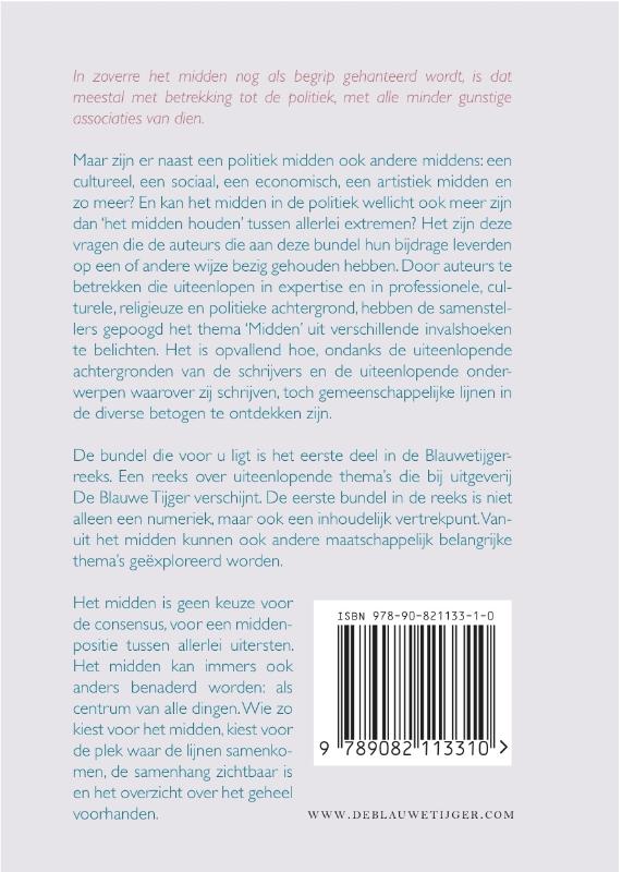 BESCHIKBAAR VIA UITGEVER! Met bijdragen van onder anderen: Martin van Creveld, Rene Cuperus, Fernand Keuleneer. In zoverre het midden nog als begrip gehanteerd wordt, is dat meestal met betrekking tot de politiek, met alle minder gunstige associaties van dien. Maar zijn er naast een politiek midden ook andere middens: een cultureel, een sociaal, een economisch, een artistiek midden en zo meer? En kan het midden in de politiek wellicht ook meer zijn dan 'het midden houden' tussen allerlei extremen? Het zijn deze vragen die de auteurs die aan deze bundel hun bijdrage leverden op een of andere wijze bezig gehouden hebben. Door auteurs te betrekken die uiteenlopen in expertise en in professionele, cul- turele, religieuze en politieke achtergrond, hebben de samenstel- lers gepoogd het thema 'Midden' uit verschillende invalshoeken te belichten. Het is opvallend hoe, ondanks de uiteenlopende achtergronden van de schrijvers en de uiteenlopende onder- werpen waarover zij schrijven, toch gemeenschappelijke lijnen in de diverse betogen te ontdekken zijn. De bundel die voor u ligt is het eerste deel in de Blauwetijger- reeks. Een reeks over uiteenlopende thema's die bij uitgeverij De Blauwe Tijger verschijnt. De eerste bundel in de reeks is niet alleen een numeriek, maar ook een inhoudelijk vertrekpunt.Van- uit het midden kunnen ook andere maatschappelijk belangrijke thema's geexploreerd worden. Het midden is geen keuze voor de consensus, voor een midden- positie tussen allerlei uitersten. Het midden kan immers ook anders benaderd worden: als centrum van alle dingen.Wie zo kiest voor het midden, kiest voor de plek waar de lijnen samenko- men, de samenhang zichtbaar is en het overzicht over het geheel voorhanden.
