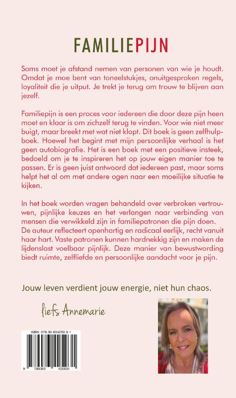 Soms moet je afstand nemen van personen van wie je houdt. Omdat je moe bent van toneelstukjes, onuitgesproken regels, loyaliteit die je uitput. Je trekt je terug om trouw te blijven aan jezelf. Familiepijn is een proces voor iedereen die door deze pijn heen moet en klaar is om zichzelf terug te vinden. Voor wie niet meer buigt, maar breekt met wat niet klopt. Dit boek is geen zelfhulpboek. Hoewel het begint met mijn persoonlijke verhaal is het geen autobiografie. Het is een boek met een positieve insteek, bedoeld om je te inspireren het op jouw eigen manier toe te passen. Er is geen juist antwoord dat iedereen past, maar soms helpt het al om met andere ogen naar een moeilijke situatie te kijken. In het boek worden vragen behandeld over verbroken vertrouwen, pijnlijke keuzes en het verlangen naar verbinding van mensen die verwikkeld zijn in familiepatronen die pijn doen. De auteur reflecteert openhartig en radicaal eerlijk, recht vanuit haar hart. Vaste patronen kunnen hardnekkig zijn en maken de lijdenslast voelbaar pijnlijk. Deze manier van bewustwording biedt ruimte, zelfliefde en persoonlijke aandacht voor je pijn.