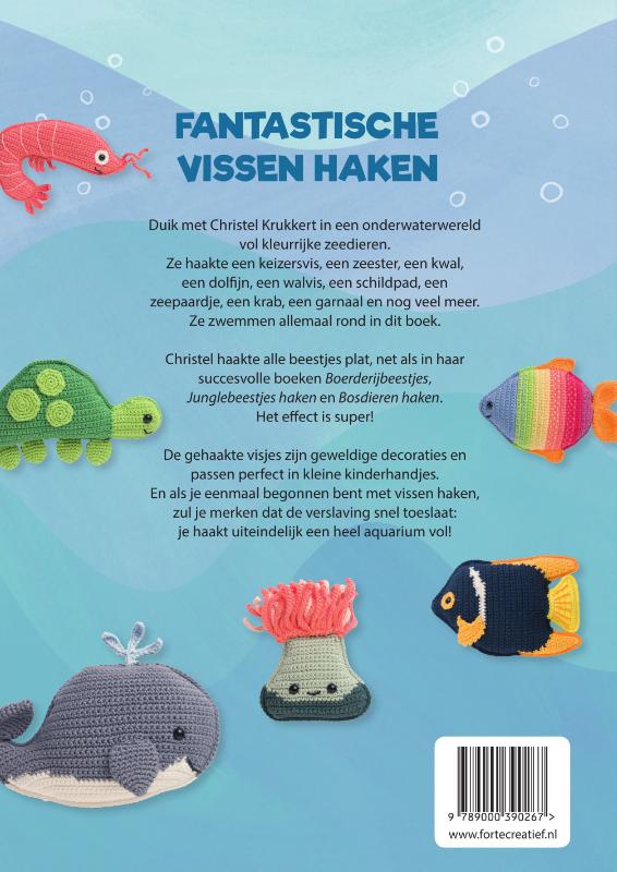 Sla een vrolijke vis aan de haak! Christel Krukkert heeft voor dit boek een hele collectie zeedieren gehaakt: een goudvis, een zeester, een kwal, een octopus, een dolfijn, een walvis, een schildpad, een zeepaardje, een krab, een garnaal en nog veel meer. Ze zijn allemaal verzameld in dit boek. Christel haakt alle beestjes plat, net als in haar succesvolle boeken Boerderijbeestjes , Junglebeestjes haken en Bosdieren haken . Voor de haakfans betekent dit dat ze niet in het rond gehaakt worden zoals bij amigurumi, maar in heen-en-weertoeren. Het effect is super! Alle haaktechnieken worden duidelijk uitgelegd en geïllustreerd, zodat ook beginnende hakers met de patronen aan de slag kunnen. De gehaakte visjes zijn geweldige decoraties en passen perfect in kleine kinderhandjes.