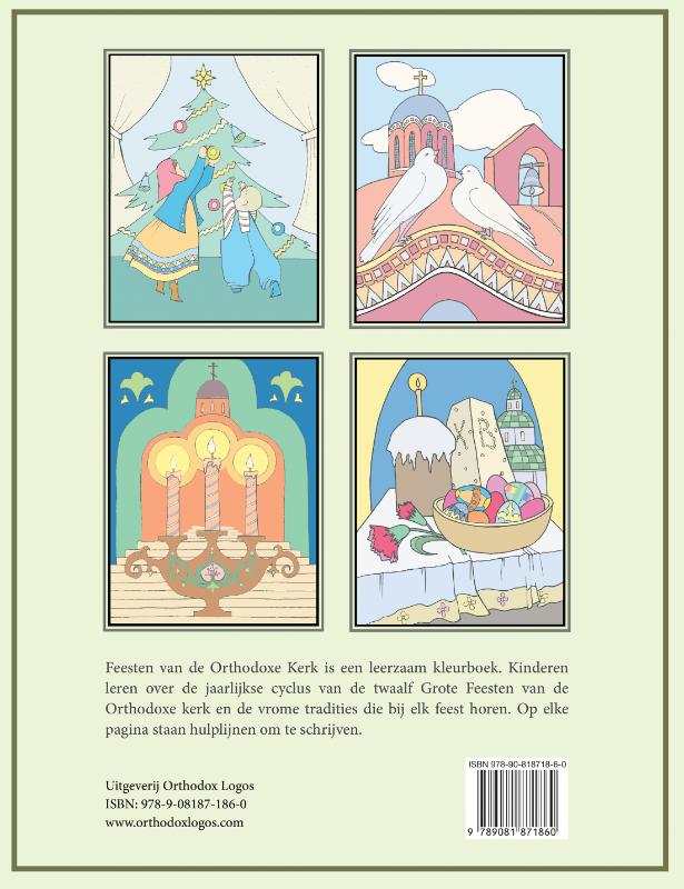 Feesten van de Orthodoxe Kerk is een leerzaam kleurboek. Kinderen leren over de jaarlijkse cyclus van de twaalf Grote Feesten van de Orthodoxe kerk en de vrome tradities die bij elk feest horen. Op elke pagina staan hulplijnen om te schrijven.