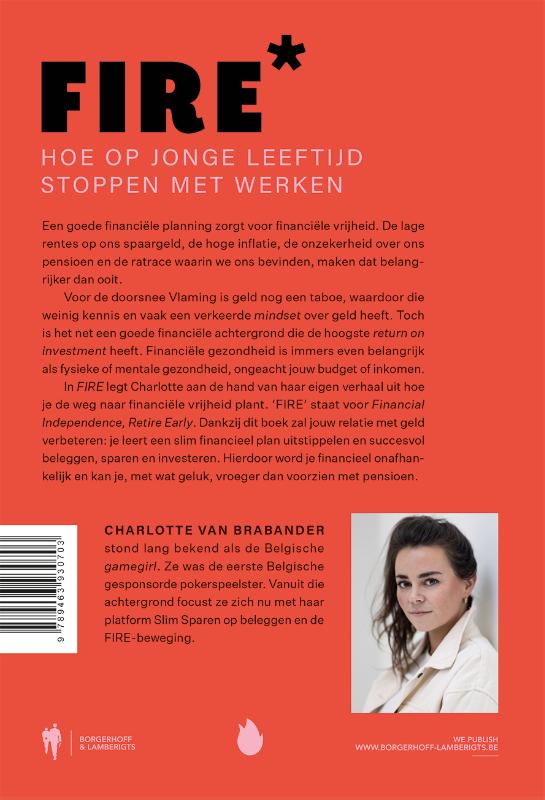 Een goede financiële planning zorgt voor financiële vrijheid. De lage rentes op ons spaargeld, de hoge inflatie, de onzekerheid over ons pensioen en de ratrace waarin we ons bevinden, maken dat belangrijker dan ooit. Voor de doorsnee Vlaming is geld nog een taboe, waardoor men weinig kennis en vaak een verkeerde mindset over geld heeft. Toch is het net een goede financiële achtergrond die de hoogste return on investment heeft. Financiële gezondheid is immers even belangrijk als fysieke of mentale gezondheid, ongeacht jouw budget of inkomen. In FIRE legt Charlotte aan de hand van haar eigen verhaal uit hoe je de weg naar financiële vrijheid plant. ‘FIRE’ staat voor Financial Independence, Retire Early. Dankzij dit boek zal jouw relatie met geld verbeteren: je leert een slim financieel plan uitstippelen en succesvol beleggen, sparen en investeren. Hierdoor word je financieel onafhankelijk en kan je, met wat geluk, vroeger dan voorzien met pensioen.