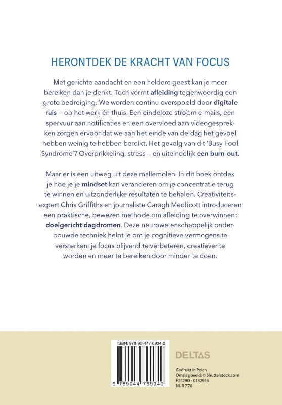 De praktische gids om je overprikkelde brein te resetten en je concentratie en creativiteit een boost te geven. Afleiding vormt tegenwoordig een groot probleem voor onze aandacht en voor een heldere geest. We worden immers continu overspoeld door digitale ruis - op het werk én thuis. Een eindeloze stroom e-mails, een spervuur aan notificaties en een overvloed aan videogesprekken zorgen ervoor dat we aan het einde van de dag het gevoel hebben weinig te hebben bereikt. Het gevolg van dit 'Busy Fool Syndrome'? Overprikkeling, stress - en uiteindelijk een burn-out. Maar er is een uitweg uit deze mallemolen. In dit boek introduceren creativiteitsexpert Chris Griffiths en journaliste Caragh Medlicott een praktische, bewezen methode om afleiding te overwinnen: doelgericht dagdromen. Deze neurowetenschappelijk onderbouwde techniek helpt je om je cognitieve vermogens te versterken, je focus blijvend te verbeteren, creatiever te worden en meer te bereiken door minder te doen.