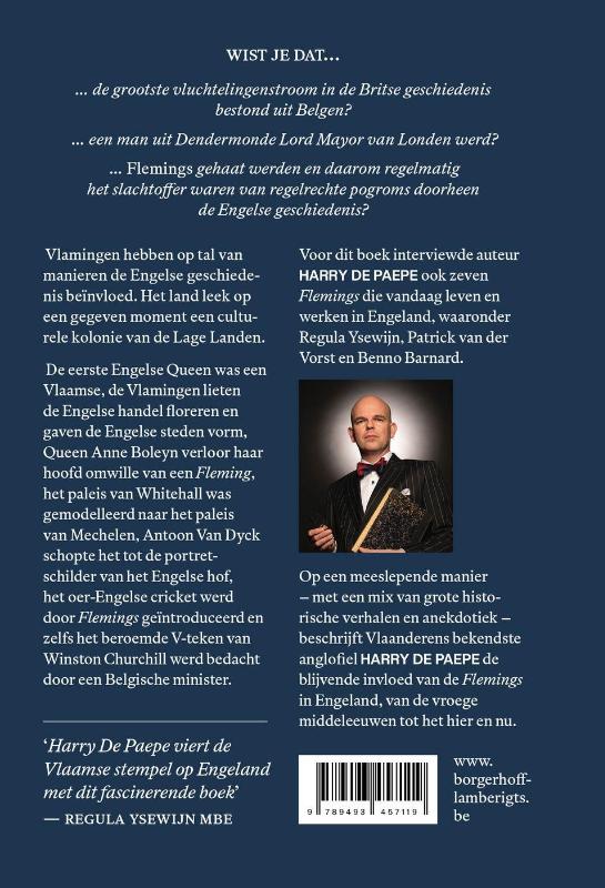 Quizvraag: hoe heet de auteur van James Bond? Antwoord: Ian Fleming. Wat weinigen weten is dat die achternaam verwijst naar de Vlaamse roots van de Engelse succesauteur. Want de Vlamingen die in de vroege middeleeuwen de oversteek naar Engeland waagden en er zich vestigden werden Flemings genoemd. Deze Flemings hebben op tal van manieren de Engelse geschiedenis beïnvloed. Zo is de eerste Engelse Queen een Vlaamse, redde een ridder uit onze contreien Willem de Veroveraar tijdens de befaamde Slag van Hastings, deden Vlamingen de Engelse handel floreren, werd Antoon Van Dyck dé portretschilder aan het Britse hof, en introduceerden Vlamingen zelfs het oer-Engelse cricket in het Verenigd Koninkrijk (en ver daarbuiten). Op een meeslepende manier – met een mix van grote historische verhalen en anekdotiek – beschrijft Harry De Paepe de blijvende invloed van de 'Flemings' in Engeland, van de vroege middeleeuwen tot het hier en nu.