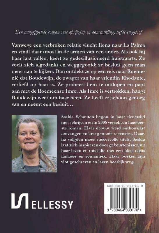 Een aangrijpende roman over afwijzing en aanvaarding, liefde en geloof. Vanwege een verbroken relatie vlucht Ilona naar La Palma en vindt daar troost in de armen van een ander. Als ook hij haar laat vallen, keert ze gedesillusioneerd huiswaarts. Ze voelt zich afgedankt en weggegooid; ze besluit geen man meer aan te kijken. Dan ontdekt ze op een reis naar Roemenië dat Boudewijn, de zwager van haar vriendin Rhodante, verliefd op haar is. Ze probeert hem te ontlopen en papt aan met de Roemeense Imre. Als Imre is vertrokken, hangt Boudewijn weer om haar heen. Ze heeft er schoon genoeg van en neemt een besluit… Saskia Schouten begon in haar tienertijd met schrijven en in 2006 verscheen haar eerste roman. Haar debuut werd enthousiast ontvangen en kreeg mooie recensies. Daarna volgden meer succesvolle titels. Saskia laat zich inspireren door gebeurtenissen uit haar leven en mixt die met een fikse dosis fantasie en romantiek. Haar boeken zijn vlot geschreven en lezen heerlijk weg.