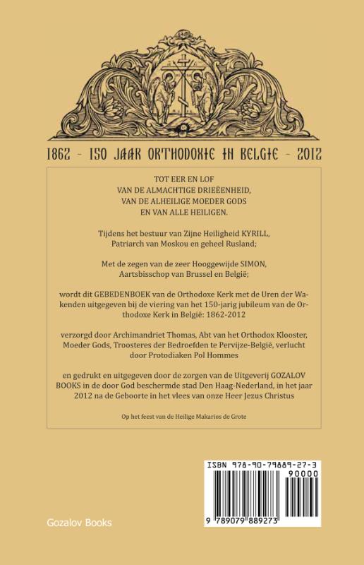 TOT EER EN LOF VAN DE ALMACHTIGE DRIEËENHEID, VAN DE ALHEILIGE MOEDER GODS EN VAN ALLE HEILIGEN. Tijdens het bestuur van Zijne Heiligheid KYRILL, Patriarch van Moskou en geheel Rusland; Met de zegen van de zeer Hooggewijde SIMON, Aartsbisschop van Brussel en België; wordt dit GEBEDENBOEK van de Orthodoxe Kerk met de Uren der Wakenden uitgegeven bij de viering van het 150-jarig jubileum van de Orthodoxe Kerk in België: 1862-2012 verzorgd door Archimandriet Thomas, Abt van het Orthodox Klooster, Moeder Gods, Troosteres der Bedroefden te Pervijze-België, verlucht door Protodiaken Pol Hommes.