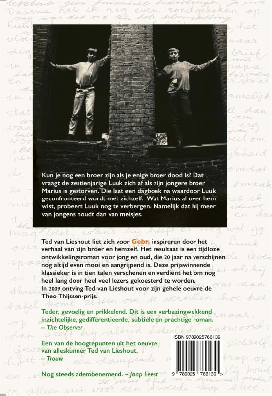 'Gebr.' is een diep ontroerende, deels autobiografische, jeugdroman geschreven door Ted van Lieshout. Deze tijdloze coming-of-age-roman vertelt het verhaal van Luuk, een jongen die opgroeit in de schaduw van zijn overleden jongere broer, Marius. Met zijn poëtische schrijfstijl biedt Ted van Lieshout een diepgaande inkijk in de thema's van rouw, verlies en familiebanden. Kun je nog een broer zijn als je enige broer dood is? Deze vraag houdt de zestienjarige Luuk bezig nadat zijn jongere broer Marius is gestorven. Elk familielid verwerkt het verlies op zijn eigen manier. Het dagboek dat Marius heeft nagelaten onthult diepgaande geheimen, waardoor Luuk geconfronteerd wordt met zichzelf. Met zijn innerlijke strijd komt ook het besef over zijn eigen geaardheid: Luuk ontdekt dat hij meer gevoelens heeft voor jongens dan voor meisjes. Dit prijswinnende verhaal, 'Gebr.', is inmiddels in tien talen vertaald. In 2009 ontving Ted van Lieshout de prestigieuze Theo Thijssen-prijs voor zijn gehele oeuvre. Ted van Lieshout heeft een indrukwekkende en vaak bekroonde literaire carrière opgebouwd. Voor 'Gebr.' liet hij zich inspireren door zijn eigen verhaal en dat van zijn broer, wat heeft geresulteerd in een prachtige ontwikkelingsroman die zowel jonge als volwassen lezers zal aanspreken. Geschikt voor lezers vanaf 12 jaar en ouder.