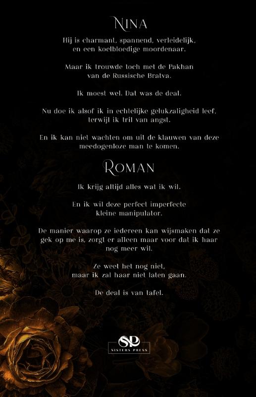 Nina. Hij is charmant, spannend, verleidelijk, en een koelbloedige moordenaar. Maar ik trouwde toch met de Pakhan van de Russische Bratva. Ik moest wel. Dat was de deal. Nu doe ik alsof ik in echtelijke gelukzaligheid leef, terwijl ik tril van angst. En ik kan niet wachten om uit de klauwen van deze meedogenloze man te komen. Roman. Ik krijg altijd alles wat ik wil. En ik wil deze perfect imperfecte kleine manipulator. De manier waarop ze iedereen kan wijsmaken dat ze gek op me is, zorgt er alleen maar voor dat ik haar nog meer wil. Ze weet het nog niet, maar ik zal haar niet laten gaan. De deal is van tafel.