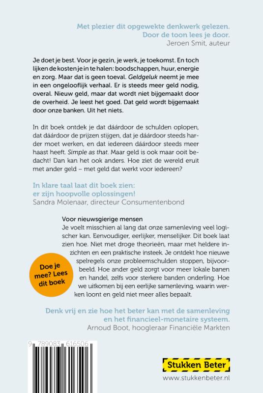 “Een heerlijk, helder boek” – Annemarie van Gaal Je doet je best. Voor je gezin, je werk, je toekomst. En toch lijken de kosten je in te halen: boodschappen, huur, energie en zorg. Maar dat is geen toeval. Geldgeluk neemt je mee in een ongelooflijk verhaal. Er is steeds meer geld nodig, overal. Nieuw geld, maar dat wordt niet bijgemaakt door de overheid. Je leest het goed. Dat geld wordt bijgemaakt door onze banken. Uit het niets. “Met plezier dit opgewekte denkwerk gelezen. Door de toon lees je door.” – Jeroen Smit, auteur In dit boek ontdek je dat dáárdoor de schulden oplopen, dat dáárdoor de prijzen stijgen, dat je dáárdoor steeds harder moet werken, en dat iedereen dáárdoor steeds meer haast heeft. Simple as that. Maar geld is ook maar ooit bedacht! Dan kan het ook anders. Hoe ziet de wereld eruit met ander geld – met geld dat werkt voor iedereen? “In klare taal laat dit boek zien: er zijn hoopvolle oplossingen!” – Sandra Molenaar, directeur Consumentenbond Voor nieuwsgierige mensen Je voelt misschien al lang dat onze samenleving veel logischer kan. Eenvoudiger, eerlijker, menselijker. Dit boek laat zien hoe. Niet met droge theorieën, maar met heldere inzichten en een praktische insteek. Je ontdekt hoe nieuwe spelregels onze probleemschulden stoppen, bijvoorbeeld. Hoe ander geld zorgt voor meer lokale banen en handel, zelfs voor sterkere banden onderling. Hoe we uitkomen bij een eerlijke samenleving, waarin werken loont en geld niet meer alles bepaalt. “Denk vrij en zie hoe het beter kan met de samenleving en het financieel-monetaire systeem.” – Arnoud Boot, hoogleraar Financiële Markten Lezersreacties Liz (5 sterren): “Een eyeopener! Dit boek laat op heldere wijze zien hoe ons geldsysteem écht werkt en hoe het anders kan. Wat ik sterk vind, is dat het blijft niet bij kritiek op het huidige systeem. Schuurman biedt juist spelregels voor een gezondere economie aan. Inspirerend, toegankelijk geschreven en hoopvol – een must-read voor iedereen die nieuwsgierig is naar een eerlijkere economie.” J. de Kam (5 sterren): “Martin Schuurman gaat met Geldgeluk terug naar de basis van ons economische systeem. Wat ooit een logische oplossing was, is nu het probleem geworden. Ik las het boek snel uit, maar des te langer blijven de ideeën plakken.” Katja de Man (4 sterren): “Een goed boek, helder geschreven voor de ‘leek’ op het gebied van geld en schuld. Martin Schuurman komt met mooie, uitvoerbare oplossingen. Krijgt de minister van Economische Zaken het ook toegestuurd?” Erik (5 sterren): “Dit boek laat zien hoe geld niet alleen een economisch is, maar ook het gevolg van morele en sociale keuzes. Martin Schuurman legt uit dat geld schuld is, en introduceert een verhelderend onderscheid tussen Plussers – zij die met geld geld verdienen – en Minners – zij die betalen om geld te mogen gebruiken. Vanuit het perspectief van geld raakt dit boek zo aan actuele uiteenlopende problemen als groeiende ongelijkheid, stress, en de illusie van welvaart. Een uitnodiging om dieper en anders te denken over geld, een aanrader!”