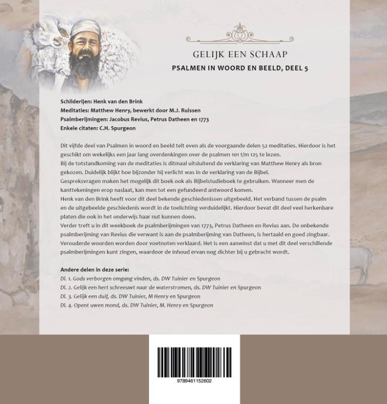 Schilderijen: Henk van den Brink Meditaties: Matthew Henry, bewerkt door M.J. Ruissen Psalmberijmingen: Jacobus Revius, 1773 en Petrus Datheen Dit vijfde deel van Psalmen in woord en beeld telt even als de voorgaande delen 52 meditaties. Hierdoor is het geschikt om wekelijks een jaar lang overdenkingen over de psalmen te lezen. Bij de totstandkoming van de meditaties is ditmaal uitsluitend de verklaring van Matthew Henry als bron gekozen. Duidelijk blijkt hoe bijzonder hij verlicht was in de verklaring van de Bijbel. Ook de noodzaak van de persoonlijke toepassing benadrukt hij voortdurend. Gespreksvragen maken het mogelijk dit boek ook als Bijbelstudieboek te gebruiken. Wanneer men de kanttekeningen erop naslaat, kan men tot de gefundeerd antwoord komen. Henk van den Brink heeft voor dit deel bekende geschiedenissen uitgebeeld. Het verband tussen de psalm en het gemaakte schilderij wordt in de toelichting verduidelijkt. Hierdoor bevat dit deel veel herkenbare platen die ook in het onderwijs haar nut kunnen doen. Verder treft u in dit weekboek de psalmberijmingen van 1773, Petrus Datheen en Revius aan. De onbekende psalmberijming van Revius die verwant is aan de psalmberijming van Datheen, is hertaald en goed zingbaar. Verouderde woorden worden door voetnoten verklaard. Het is een aanwinst dat u met dit deel verschillende psalmbermijmingen kunt zingen, waardoor de inhoud van deze psalmen nog dichter bij u gebracht wordt. Andere delen in deze serie: Dl. 1. Gods verborgen omgang vinden, ds. DW Tuinier en Spurgeon Dl. 2. Gelijk een hert schreeuwt naar de waterstromen, ds. DW Tuinier en Spurgeon Dl. 3. Gelijk een duif, ds. DW Tuinier, M Henry en Spurgeon Dl. 4. Opent uwen mond, ds. DW Tuinier, M. Henry en Spurgeon