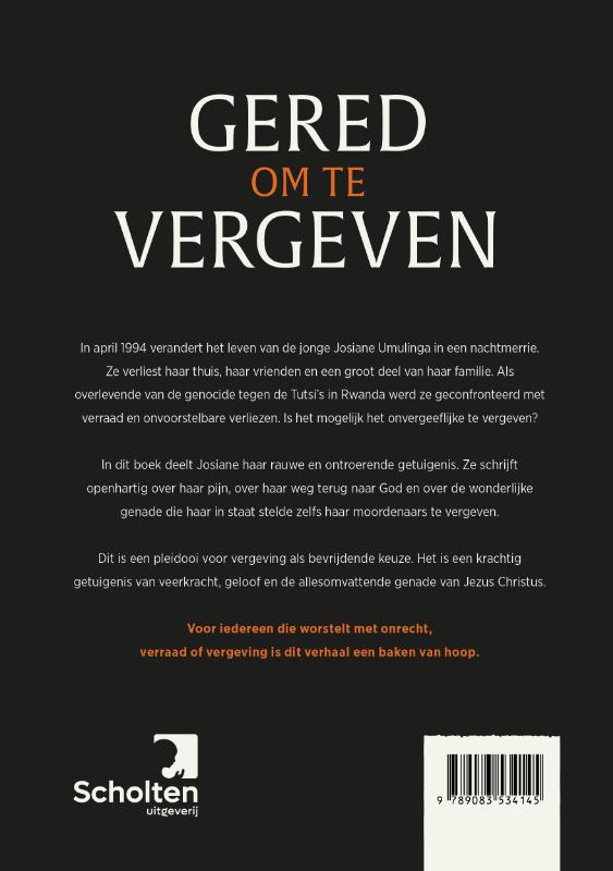 Vergeving is een belangrijk thema in het christelijk geloof. Maar hoe kun je vergeven als de mensen die jij vertrouwde, je eigen familie hebben vermoord? In Gered om te vergeven vertelt de Rwandese Josiane hoe God haar hielp om te vergeven en hoe dit haar leven compleet veranderde. Josiane was nog maar veertien jaar oud toen in Rwanda de genocide op de Tutsi’s plaats vond. In een wereld waarin buren en vrienden in moordenaars veranderden, verloor ze haar moeder, vijf van haar broertjes en zusjes, haar veilige thuis – en bijna haar leven. In het boek vertelt ze over deze gruwelijke gebeurtenissen en hoe dit verdriet jarenlang op haar leven drukte. Maar dit is niet alleen een verhaal over onvoorstelbaar lijden. Het is ook een krachtig getuigenis van geloof, veerkracht en vergeving. Vele jaren na de traumatische gebeurtenissen, leerde God haar om de moordenaars te vergeven en vond ze stap voor stap genezing voor haar hart. Met haar boek hoopt ze ook andere christenen te laten zien wat de onvoorstelbare kracht van vergeving is.