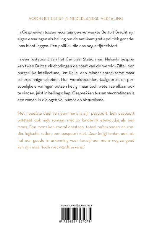 'Het nobelste deel van een mens is zijn paspoort.’ In 'Gesprekken tussen vluchtelingen' verwerkte Bertolt Brecht zijn eigen ervaringen als balling om de anti-immigratiepolitiek genadeloos bloot leggen. Een politiek die ons nog altijd teistert. In een restaurant van het Centraal Station van Helsinki bespreken twee Duitse vluchtelingen de staat van de wereld: Ziffel, een burgerlijke intellectueel, en Kalle, een minder spraakzame maar scherpzinnige arbeider. Hun wereldbeelden, taalgebruik en persoonlijke ervaringen botsen hevig, maar toch weten ze elkaar ook te vinden, juist in ballingschap. 'Gesprekken tussen vluchtelingen' is een roman in dialogen vol humor en absurdisme. 'Het nobelste deel van een mens is zijn paspoort. Een paspoort ontstaat ook niet zomaar, niet zo kinderlijk eenvoudig als een mens. Een mens kan overal ontstaan, totaal onbezonnen en zon der logische reden, een paspoort niet. Daar krijgt ie dan ook, als het een goede is, erkenning voor, terwijl een mens nog zo goed kan zijn maar toch niet wordt erkend.’ Uit het Duits vertaald door Elbert Besaris