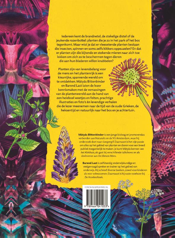 Iedereen kent wel de brandnetel, de stekelige distel of de jeukende rozenbottel: planten die je zo in het park of het bos tegenkomt. Maar wist je dat er vleesetende planten bestaan die insecten, spinnen en soms zelfs kikkers oppeuzelen? En dat er planten zijn die bijtende en stekende mieren naar zich toe lokken om zich zo te beschermen tegen dieren die aan hun bladeren willen knabbelen? Planten zijn essentieel voor het bestaan van de mens en het plantenrijk is een kleurrijke, spannende wereld om te ontdekken. Voor lezers vanaf 9 jaar. Mátyás Bittenbinder en Barend Last laten de lezer kennismaken met de verrassingen van het plantenrijk aan de hand van een heleboel weetjes en feiten, prachtige illustraties en foto's én levendige verhalen die de lezer meenemen naar de tijd van de oude Grieken, de heksentijd en natuurlijk naar het bos in je achtertuin.
