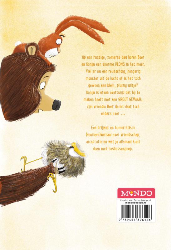 Op een rustige, zomerse dag horen Beer en Konijn een enorme PLONS in het meer. Viel er nu een reusachtig, hongerig monster uit de lucht of is het toch gewoon een klein, pluizig uiltje? Konijn is ervan overtuigd dat hij te maken heeft met een GROOT GEVAAR. Zijn vriendin Beer denkt daar toch anders over ... Een briljant en humoristisch (voorlees)verhaal over vriendschap, acceptatie en wat je allemaal kunt doen met bosbessenpoep.