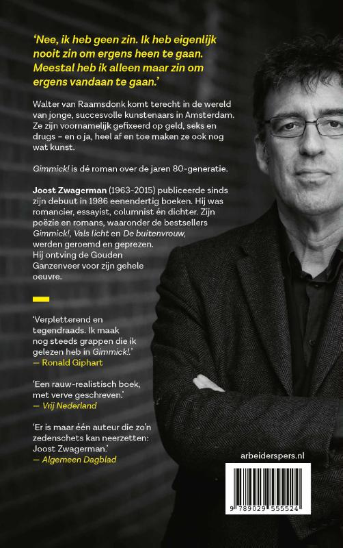 ‘Nee, ik heb geen zin. Ik heb eigenlijk nooit zin om ergens heen te gaan. Meestal heb ik alleen maar zin om ergens vandaan te gaan.’ Walter van Raamsdonk komt terecht in de wereld van jonge, succesvolle kunstenaars in Amsterdam. Ze zijn voornamelijk gefixeerd op geld, seks en drugs – en o ja, heel af en toe maken ze ook nog wat kunst. Gimmick! is dé roman over de jaren 80-generatie. Ruim 250.000 exemplaren verkocht. ‘Verpletterend en tegendraads. Ik maak nog steeds grappen die ik gelezen heb in Gimmick! .’ – Ronald Giphart