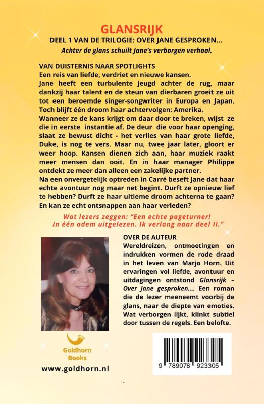 GLANSRIJK Deel 1 van de trilogie: Over Jane gesproken… Achter de glans schijnt Jane’s verborgen verhaal Van duisternis naar spotlights. Een reis van liefde, verdriet en nieuwe kansen. Jane heeft een turbulente jeugd achter de rug, maar dankzij haar talent en de steun van dierbaren groeit ze uit tot een beroemde singer-songwriter in Europa en Japan. Toch blijft één droom haar achtervolgen: Amerika. Wanneer ze de kans krijgt om daar door te breken, wijst ze die in eerste instantie af. De deur die voor haar openging, slaat ze bewust dicht - het verlies van haar grote liefde, Duke, is nog te vers. Maar nu, twee jaar later, gloort er weer hoop. Kansen dienen zich aan, haar muziek raakt meer mensen dan ooit. En in haar manager Philippe ontdekt ze meer dan alleen een zakelijke partner. Na een onvergetelijk optreden in Carré beseft Jane dat haar echte avontuur nog maar net begint. Durft ze opnieuw lief te hebben? Durft ze haar ultieme droom achterna te gaan? En kan ze echt ontsnappen aan haar verleden?