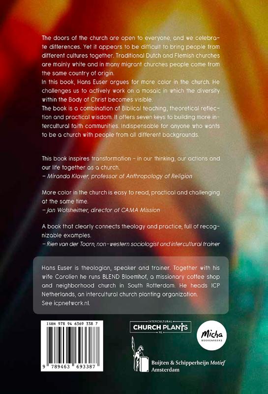 The doors of the church are open to everyone, and we celebrate differences. Yet it appears to be difficult to bring people from different cultures together. Traditional Dutch and Flemish churches are mainly white and in many migrant churches people come from the same country of origin. In this book, Hans Euser argues for more color in the church. He challenges us to actively work on a mosaic in which the diversity within the Body of Christ becomes visible. The book is a combination of Biblical teaching, theoretical reflection and practical wisdom. It offers seven keys to building more intercultural faith communities. Indispensable for anyone who wants to be a church with people from all different backgrounds. This book inspires transformation – in our thinking, our actions and our life together as a church. — Miranda Klaver, professor of Anthropology of Religion More color in the church is easy to read, practical and challenging at the same time. — Jan Wolsheimer, director of CAMA Mission A book that clearly connects theology and practice, full of recognizable examples. — Rien van der Toorn, non-western sociologist and intercultural trainer Hans Euser is theologian, speaker and trainer. Together with his wife Carolien he runs BLEND Bloemhof, a missionary coffee shop and neighborhood church in South Rotterdam. He heads ICP Netherlands, an intercultural church planting organization. See icpnetwork.nl.