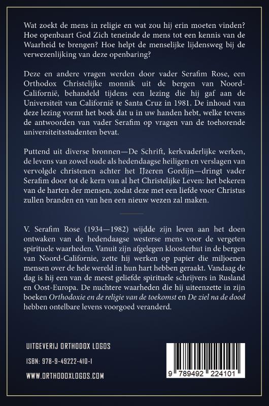 Wat zoekt de mens in religie en wat zou hij erin moeten vinden? Hoe openbaart God Zich teneinde de mens tot een kennis van de Waarheid te brengen? Hoe helpt de menselijke lijdensweg bij de verwezenlijking van deze openbaring? Deze en andere vragen werden door vader Serafim Rose, een Orthodox Christelijke monnik uit de bergen van Noord- Californie, behandeld tijdens een lezing die hij gaf aan de Universiteit van Californie te Santa Cruz in 1981. De inhoud van deze lezing vormt het boek dat u in uw handen hebt, welke tevens de antwoorden van vader Serafim op vragen van de toehorende universiteitsstudenten bevat. Puttend uit diverse bronnen—De Schrift, kerkvaderlijke werken, de levens van zowel oude als hedendaagse heiligen en verslagen van vervolgde christenen achter het IJzeren Gordijn dringt vader Serafim door tot de kern van al het Christelijke Leven: het bekeren van de harten der mensen, zodat deze met een liefde voor Christus zullen branden en van hen een nieuw wezen zal maken. V. Serafim Rose (1934-1982) wijdde zijn leven aan het doen ontwaken van de hedendaagse westerse mens voor de vergeten spirituele waarheden. Vanuit zijn afgelegen kloosterhut in de bergen van Noord-Californie, zette hij werken op papier die miljoenen mensen over de hele wereld in hun hart hebben geraakt. Vandaag de dag is hij een van de meest geliefde spirituele schrijvers in Rusland en Oost-Europa. De nuchtere waarheden die hij uiteenzette in zijn boeken Orthodoxie en de religie van de toekomst en De ziel na de dood hebben ontelbare levens voorgoed veranderd.