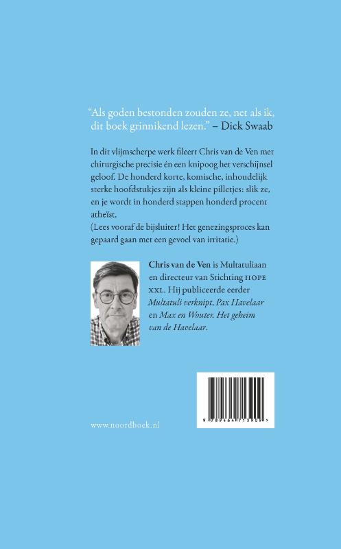 In dit vlijmscherpe werk fileert Chris van de Ven met chirurgische precisie én een knipoog het verschijnsel geloof. De honderd korte, komische, inhoudelijk sterke hoofdstukjes zijn als kleine pilletjes: slik ze, en je wordt in honderd stappen honderd procent atheïst. (Lees vooraf de bijsluiter! Het genezingsproces kan gepaard gaan met een gevoel van irritatie.) Chris van de Ven is Multatuliaan en directeur van Stichting HOPE XXL. Hij publiceerde eerder Multatuli verknipt, Pax Havelaar en Max en Wouter. Het geheim van de Havelaar. “Als goden bestonden zouden ze, net als ik, dit boek grinnikend lezen.” - Dick Swaab