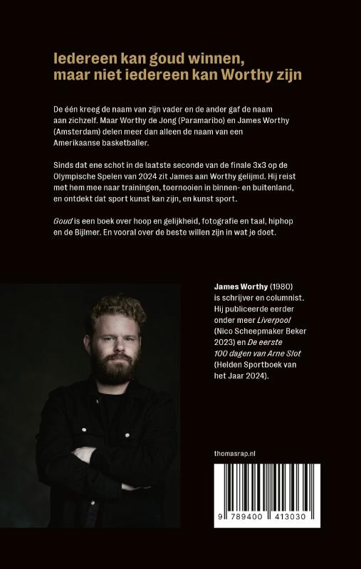 Iedereen kan goud winnen, maar niet iedereen kan Worthy zijn. De één kreeg de naam van zijn vader en de ander gaf de naam aan zichzelf. Maar Worthy de Jong (Paramaribo) en James Worthy (Amsterdam) delen meer dan alleen de naam van een Amerikaanse basketballer. Sinds dat ene schot in de laatste seconde van de finale 3x3 op de Olympische Spelen van 2024 zit James aan Worthy gelijmd. Hij reist met hem mee naar trainingen, toernooien in binnen- en buitenland, en ontdekt dat sport kunst kan zijn, en kunst sport. Goud is een boek over hoop en gelijkheid, fotografie en taal, hiphop en de Bijlmer. En vooral over de beste willen zijn in wat je doet.