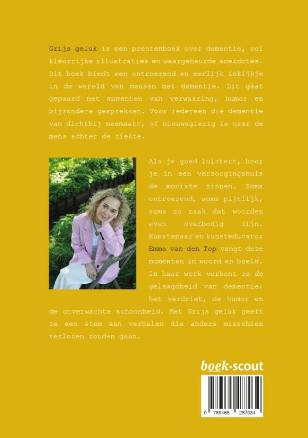 Grijs geluk is een prentenboek over dementie, vol kleurrijke illustraties en waargebeurde anekdotes. Dit boek biedt een ontroerend en eerlijk inkijkje in de wereld van mensen met dementie. Dit gaat gepaard met momenten van verwarring, humor en bijzondere gesprekken. Voor iedereen die dementie van dichtbij meemaakt, of nieuwsgierig is naar de mens achter de ziekte.