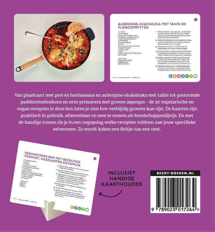 Een verrassende avondmaaltijd boordevol groenten op tafel zetten? Met de 30 receptkaarten van 'Groente' ontdek je de veelzijdige manieren waarop je groente kunt bereiden. Maak aubergine-shakshuka met tahin en pijnboompitten, verras je gasten met gestoomde buns met paddenstoelen-koolvulling en gewokte paksoi, of verwen jezelf met een goedgevulde dahl met crispy kokostopping. Deze box biedt volop inspiratie om elke dag lekkere vega of vegan gerechten op tafel te zetten - of je nu veel of juist weinig tijd hebt. De kaarten zijn praktisch in gebruik, afneembaar én mee te nemen als boodschappenlijstje. En met behulp van de handige iconen zie je in een oogopslag welke recepten voldoen aan jouw specifieke eetwensen. Met de receptkaarten van Becht wordt koken een fluitje van een cent.