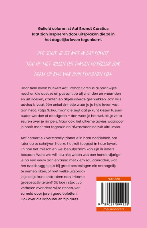 Geliefd columnist Aaf Brandt Corstius laat zich inspireren door uitspraken die ze in het dagelijks leven tegenkomt en die haar raken of aan het denken zetten – een perfect cadeauboek Haar hele leven hunkert Aaf Brandt Corstius al naar wijze raad, en die doet ze en passant op bij vrienden en vreemden en uit boeken, kranten en afgeluisterde gesprekken. Zo’n wijs advies is vaak één enkel zinnetje waar je je hele leven wat aan hebt. Katja Schuurman die zegt dat je kunt kiezen tussen ouder worden of doodgaan – dan weet je het wel, als je zit te zeuren over je rimpels. Maar ook: het ultieme advies waardoor je nooit meer met tegenzin de afwasmachine zult uitruimen. Aaf noteert elk verstandig zinnetje in haar notitieblok, om later op te schrijven hoe ze het zelf toepast in haar leven. En hoe het misschien wel behulpzaam kan zijn in ieders bestaan. Want wie wil nou niet weten wat een honderdjarige je na een eeuw aan ervaring met klem zou aanraden, wat het ezelsbruggetje is bij grote beslissingen die onmogelijk te nemen lijken, of met welke uitspraak je je altijd kunt onttrekken aan irritante groepsactiviteiten? Dit boek staat vol verhalen over deze wijze zinnen, verzameld door jaren goed opletten. Ook over die kabouter en zijn muts. In de pers ‘Aaf Brandt Corstius heeft een geweldige, onderkoelde humor. Het boek zit vol grappige anekdotes. Ik ben fan van Aaf.’ AD Mezza ‘Aaf Brandt Corstius verzamelde treffende uitspraken in de categorie ‘daar heb je wat aan’ en stopte die in het leuke (cadeau)boek Gun iedere kabouter zijn eigen muts .' Margriet ‘Schrijfster Aaf Brandt Cortius heeft een bibliotheek aan behulpzame zinnen in haar hoofd. Bij elke gelegenheid plopt er wel een naar boven. In dit boek deelt ze deze zinnen op geestige wijze en hoe ze bruikbaar zijn in het leven.' Avrobode ‘Hartveroverend onhandig en met veel gevoel voor drama en zelfspot.’ NRC ‘Even geestig als droevig.’ Het Parool ‘Hilarische en herkenbare avonturen.’ JAN