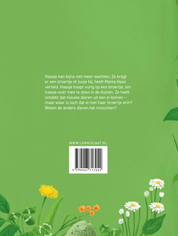 Haasje kan bijna niet meer wachten. Ze krijgt er een broertje of zusje bij, heeft Mama Haas verteld. Haasje hoopt vurig op een broertje, om haasje-over mee te doen in de duinen. Zusjes heeft ze al genoeg. Haasje gaat op zoek naar het ei waar het nieuwe haasje uit zal komen, want hazen komen toch uit een vrolijk gekleurd ei? Op haar zoektocht ontdekt ze allerlei verschillende eieren en de dieren die daaruit komen, van de scholekster tot de ringslang en van de krab die haar eitjes onder haar schild bewaart tot de koekoek die haar ei in het nest van een andere vogel legt. En thuis wacht haar een verrassing… Maartje Kouwen en Evy Van Guyse, die eerder samen Blaadjesboek maakten, slaan de handen ineen voor dit prachtige, humoristische prentenboek dat niet alleen een grappig verhaal herbergt, maar ook allerlei natuurfeitjes.